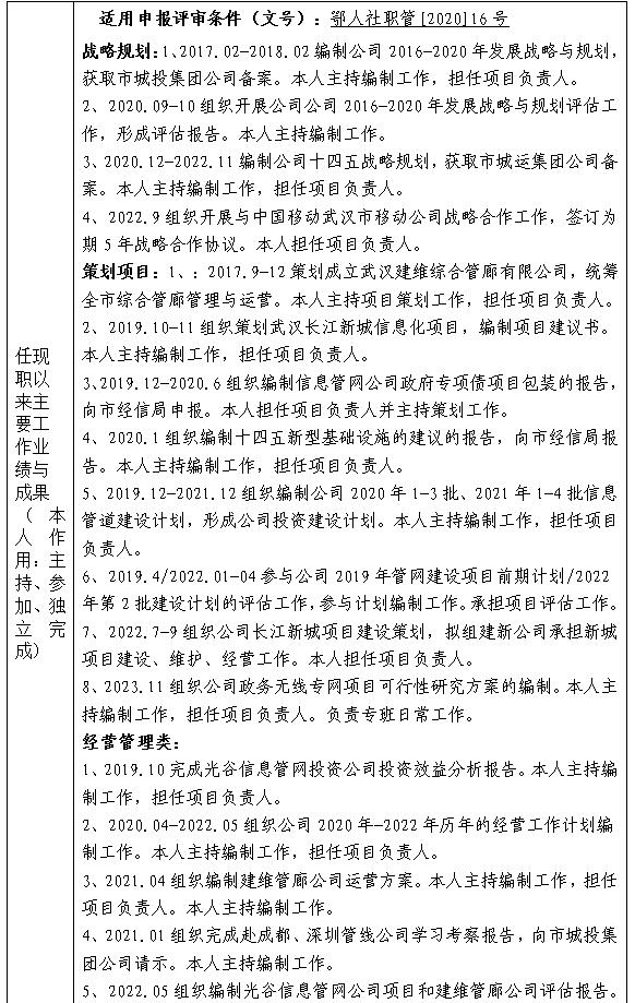 武漢市晉升建筑智能化專業(yè)高級職務(wù)綜合考評一覽表